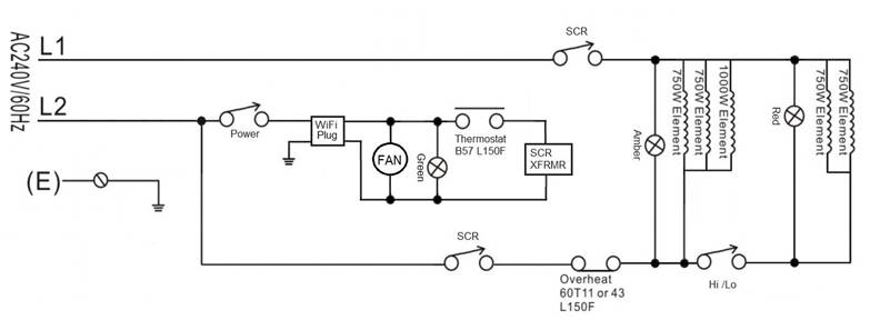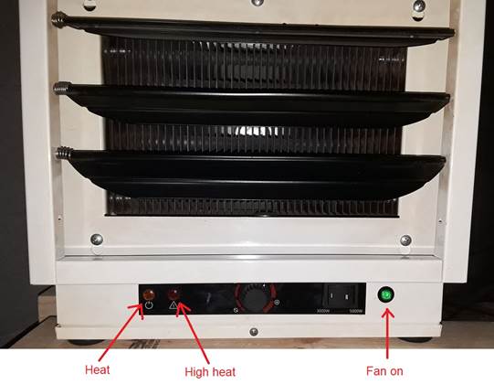 The existing neon lights were refunctioned to show when which heater elements are on. Amber is the 2500 watt array and Red is the 1500 watt array. A green 120Vac LED indicator was added to show that the unit is enabled by the smart plug. In a overheat condition, the fan will continue to run with heaters forced off.